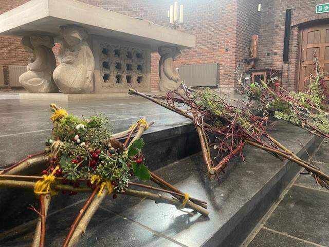 van takken, touw en draad vormen we een ster, de ster wordt opgevuld met takken, knoppen en bollen en licht.